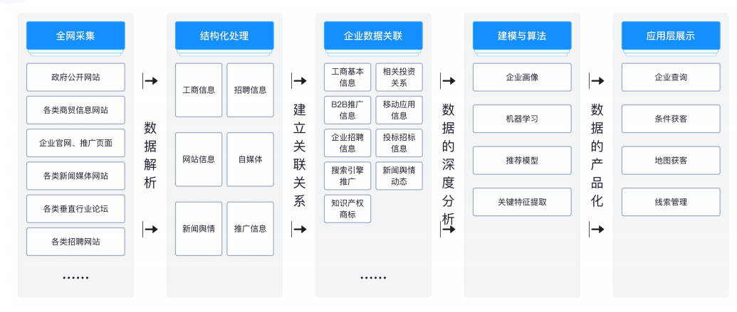 利用大數(shù)據(jù)+AI人工技術進行全網(wǎng)數(shù)據(jù)采集、清洗加工,智能搭建企業(yè)資料庫,包括企業(yè)工商信息、資質(zhì)、產(chǎn)品、 推廣、企業(yè)電話等...